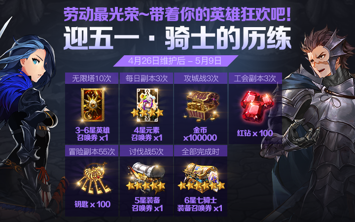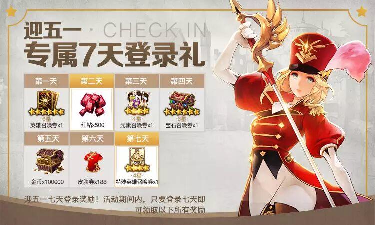 - 欢庆五一劳动节专属7天登录礼更新后将上线,各位骑士在活动期间登录即可领取丰厚奖励,登录第七天还可召唤一名特殊英雄,壮大你的骑士队伍。