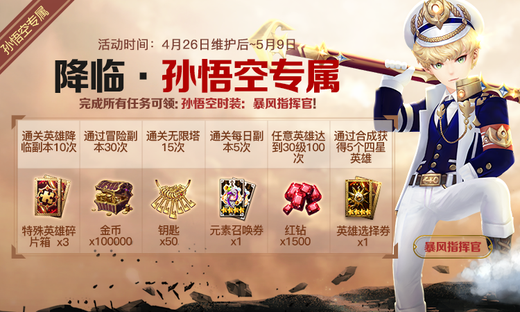4月26日更新:四皇孙悟空降临,孙悟空降临副本,签到领特殊英雄等福利活动
