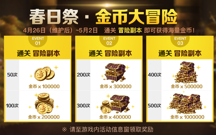 - 金币大冒险活动为各位骑士准备了一共250万的金币奖励,只要达成通关冒险副本一定次数的目标,就可以领取大量金币的丰厚奖励。