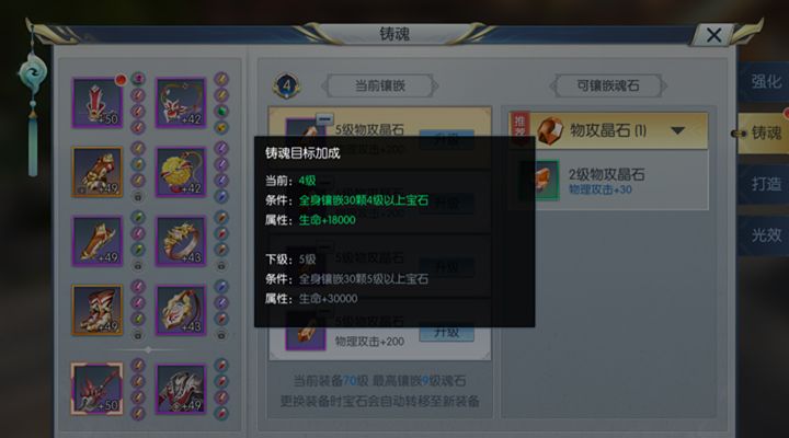 2、因为晶石等级越高,对玩家的增益越大,所以玩家肯定想着尽量的提升自身晶石的等级,这个时候需要注意,建议不要一直提升装备的一个部位的晶石,如全身十个部位,一直提升武器上的晶石等级,应该同时提升所有部位上装备的等级,因为在全身装备上镶嵌了足够数量的晶石且达到一定等级的时候会获得额外的属性加成,例如全身镶嵌30颗4级以上的晶石时,会增加玩家18000的生命值。