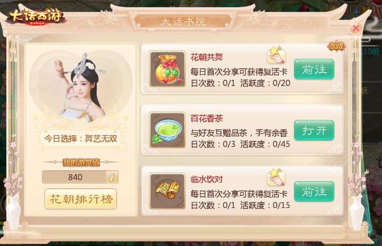 柳色青青,花朝游赏来跳舞。“花朝游赏”活动期间,跟随舞动的节拍,加入启花朝共舞活动,累积花朝共舞单项游赏值,玩家还有机会赢取“花朝舞王”专属称谓!