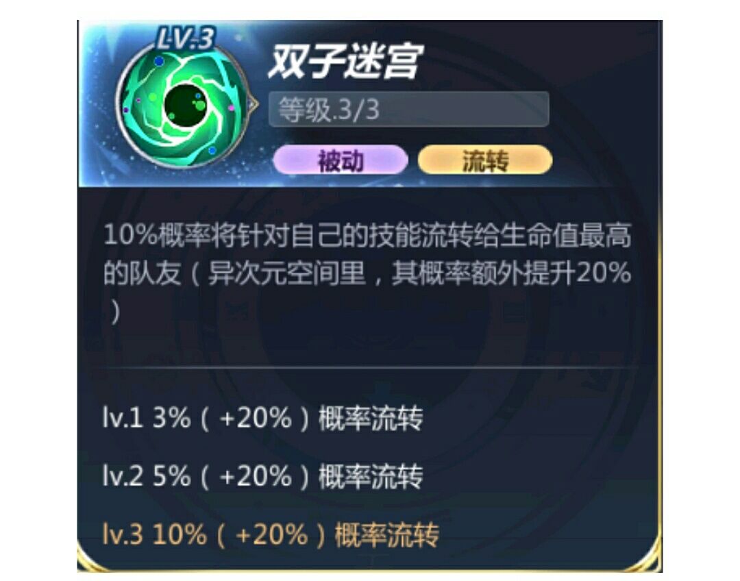 3%(5%/10%)概率将针对自己的技能流转给生命值最高的队友(异次元空间里,其概率提升20%)。