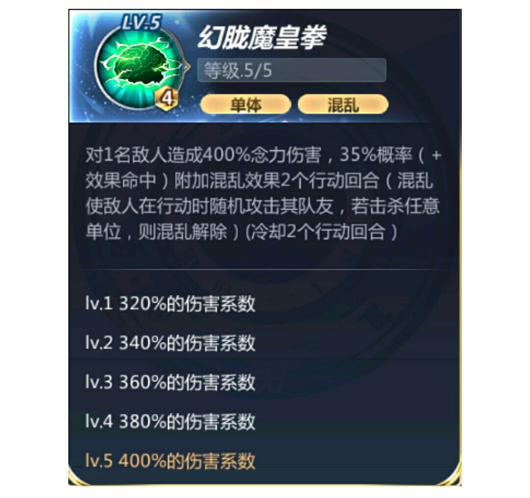 对一名敌人造成320%(340%/360%/380%/400%)的念力伤害,35%概率( 效果命中)附加混乱效果2个行动回合(混乱使敌人在行动时随机攻击其队友,若击杀任意单位,则混乱解除)