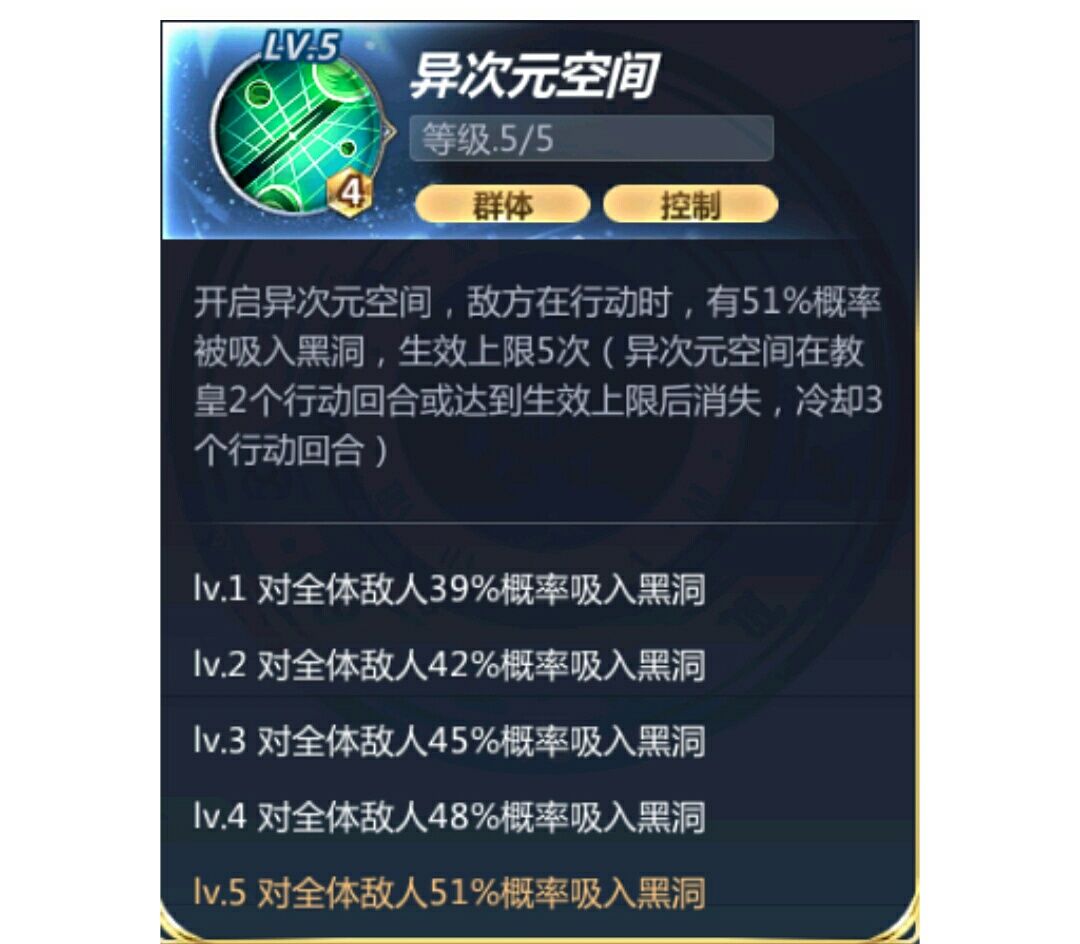 开启异次元空间,敌方在行动时,有39%(42%/45%/48%/51%)概率被吸入黑洞,生效上限5次(异次元空间在教皇2个行动回合或达到生效上限后消失,冷却2个行动回合)(异次元空间不可叠加)