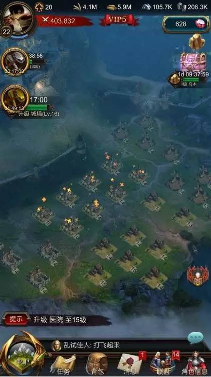 农场*8个,伐木场*10个,采石场*4个,铁矿场*4个,急救营地*8个,士兵训练营*8个;