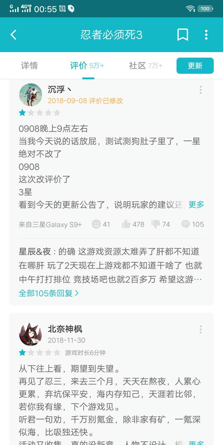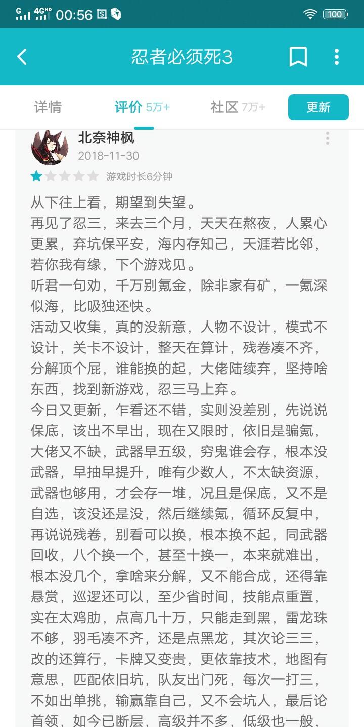 ,我们可以自己去看五星好评的玩家信息,基本都是别的游戏什么都没有,就只有简单的一句忍三NB的五星好评,而低分差评却是很多玩家的肺腑之言,我截图的这个人估计有千字了,那么我就想问游戏的运营和策划们是否在关注游戏的口碑,忍三到底是无良奸商的坑钱游戏还是能让玩家与商家双赢的高分佳作