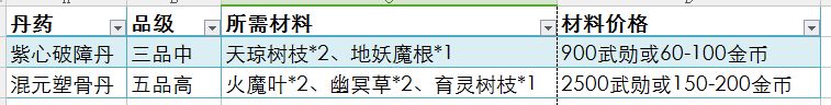 除此之外可以选择紫心破障丹和混元塑骨丹获取火灵,从材料价格上不难看出,紫心破障丹是性价比最高的丹药。