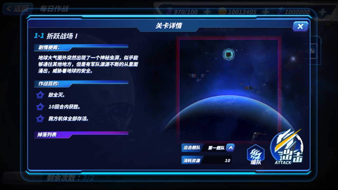 地球大气圈外突然出现了一个神秘虫洞,似乎能够通往其他地方,但是有军队源源不断的从里面涌出,威胁着地球的安全。所以作战目的为将敌军全部歼灭,10回合内获胜和我方机体全部存活即可获得掉落套装奖励。套装有铁壁、强袭等,2件套装、4件套装激活都会触发相应的对战buff。
