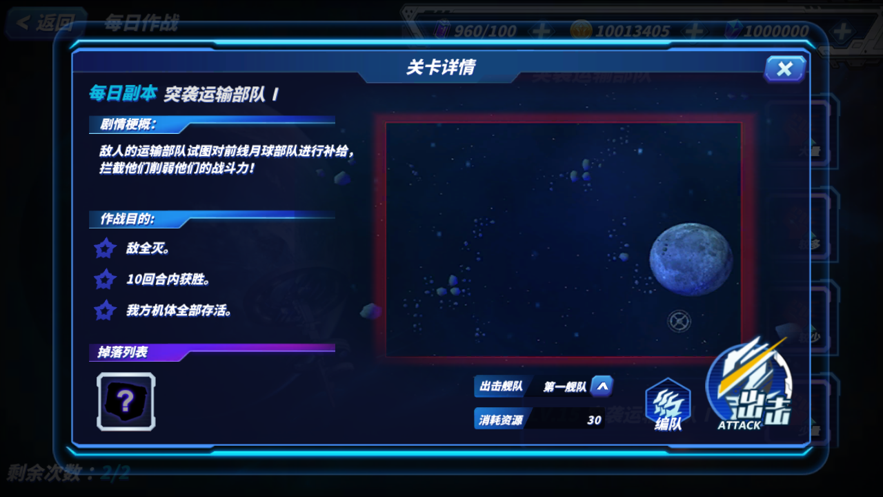 敌人的运输部队试图对前线月球部队进行补给,拦截他们削弱他们的战斗力!作战目的为将敌军全部歼灭,10回合内获胜,并且我方机体全部存活。该副本可以掉落的物品有中级机师特技包和低级机师特技包。