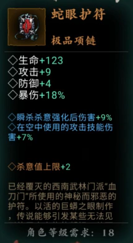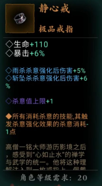 【戒指】静心戒(也可以戴回血的戒指,只要有杀意值上限+1的词缀属性即可)