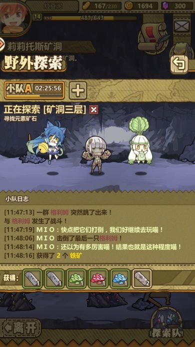 在矿洞中通过消耗体力和矿镐开采不同属性的矿物以强化魔物娘