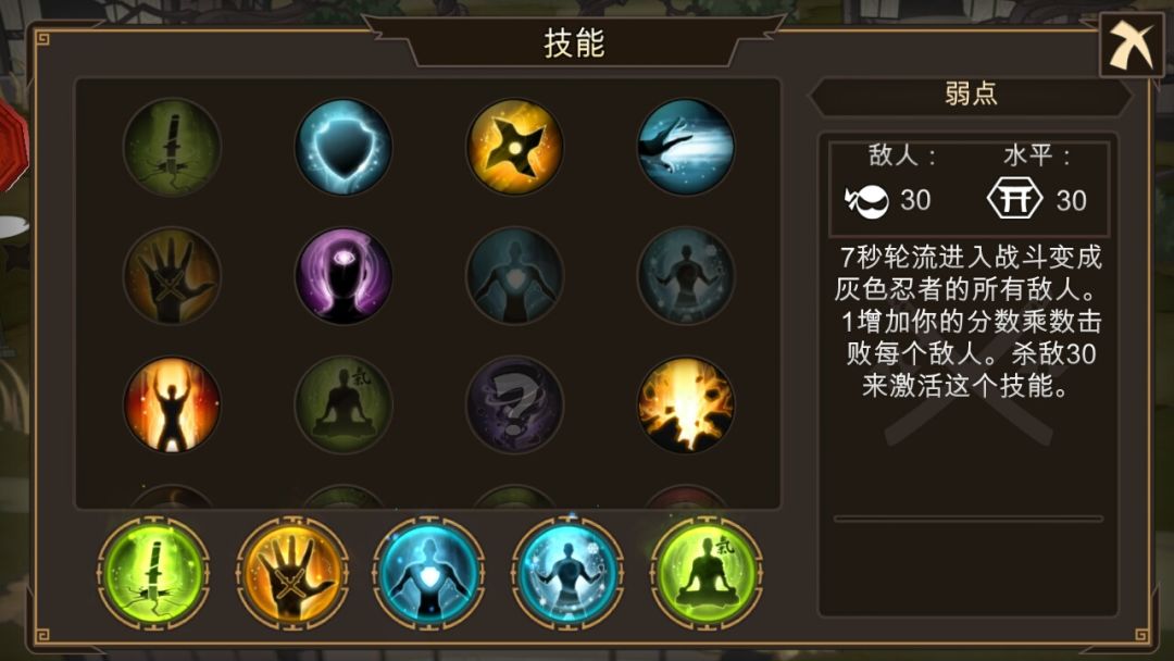 我一个清空技能都没放,加分技能只放了有辅助效果的冬日寒意(带减速敌人十秒效果)和内部储备(回一格血),然后就是武器掌握(加武器范围和使用时间)和神圣武器(激活时掉下两把武士刀),最后一个我放的是文罢工(这翻译… 激活时增加攻击范围)。