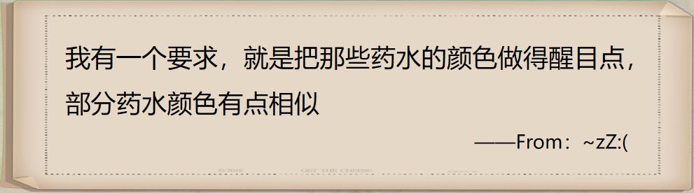 那么为了更好地提高药水功能的辨识度,之后我们可能还会增加更多的提示,甚至会考虑在瓶子上面做一些文字性的提示,这样让大家一眼看到以后就知道这个药水是干什么的,这会再进一步改进。