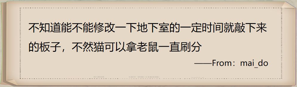 对于地下室中一定时间就会敲下来的板子,猫可以拿老鼠一直在这里刷分,这边牵涉到两个问题。