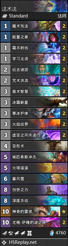 法术法的表现只能说是差强人意,我玩的时候只有50%的胜率(可能因为我穷),低段位娱乐可以用用,不建议用来上分。冲击和创世建议满编,我只有一张就凑合用了。起手有龙语、洪流和神雷诺可以留,冰系法术用来拖回合数,清场基本靠盒子,盒子翻盘是真的快乐,娱乐型玩家一定不能错过法术法!