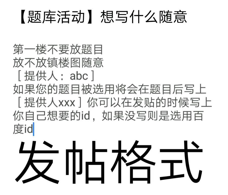 单独发新帖,并在标题中带上【题库活动】,即视为参加活动。如下图,给微信提供的题目及答案则单独发在每位吧友的帖子中。