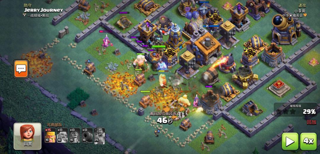 进攻细节:胖车在进攻上非常害怕对手各种地面陷阱(弹簧和弹射类),所以当炸弹兵在攻克外部城墙后,最好先使用少量狂暴野蛮人探路和清边,在陷阱被触发后,再安全使用胖车进攻。