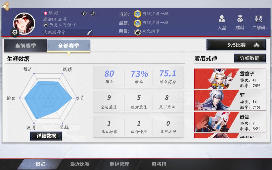 我不知道我算是个什么水平,之前也从来没有看过这游戏,式神技能啥都不知道所以刚玩是被吊打的,靠着本命雪童子硬是打上去了,我这个憨憨一开始还把她当输出玩(小声bb)