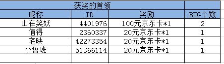 提交有效BUG的玩家:活动结束后抽取五名幸运玩家送出京东卡20元一张