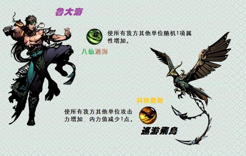 主动技能“八仙过海”:使所有我方单位随机1项属性增加[内力+1]点。