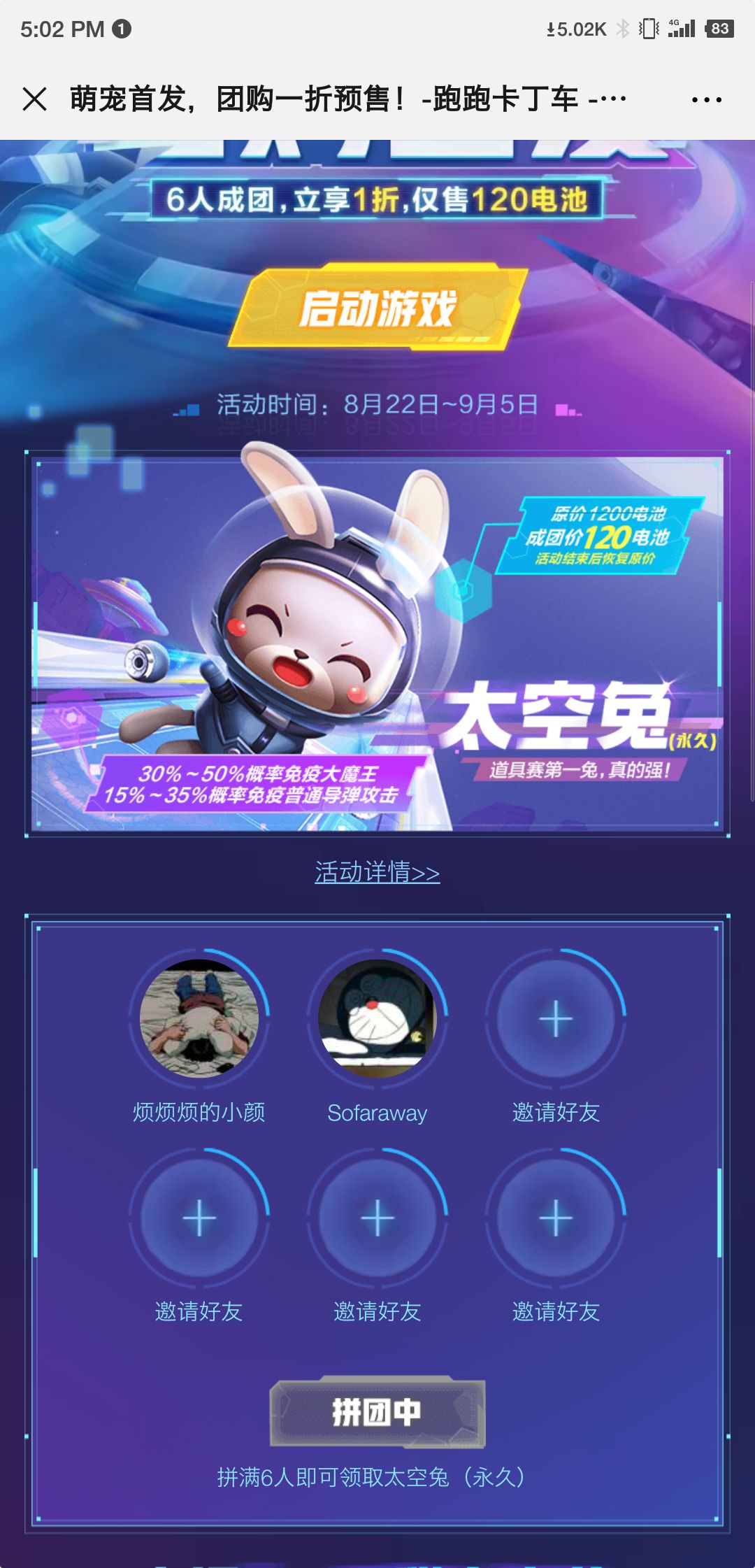兔子拼团啦,来来来,位置还有4个,安卓微信