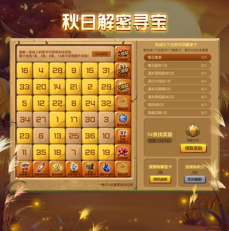 庆祝新服开启,新的庆典活动也将上线,乐趣与奖品并重的解密寻宝活动。在完成日常任务时,都可以获得解密卡,来点亮对应的数字,每点亮一个数字时就可以获得一次奖励,当点亮的数字连成横竖或斜着的一排时还可以领取觉醒碎片、红钻等升级奖励。