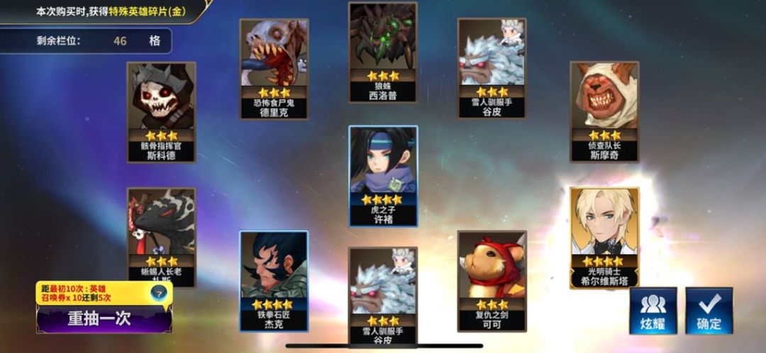所有新玩家享有无限抽卡的超级buff,在首次十连召唤英雄时可无限次“抽卡”,抽到的特殊英雄可以放在临时保管箱里,最后可以在临时保管箱里选出你喜欢的英雄。新玩家们可以非常轻松地收集到自己最爱的本命英雄,愉快地展开这段奇幻冒险。