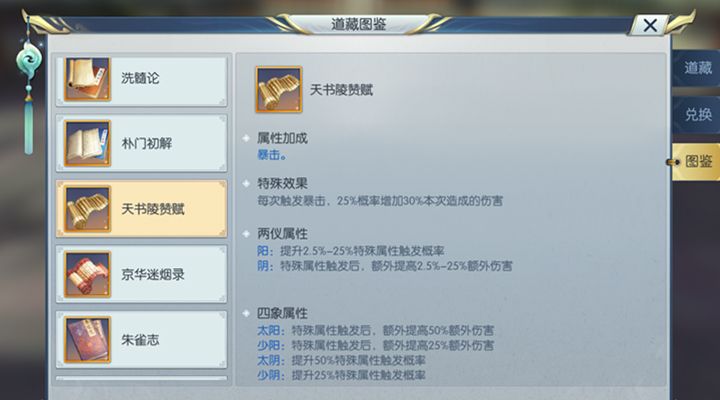 天书陵赞赋(未提升)特殊效果:每次触发暴击,25%增加30%本次造成的伤害。