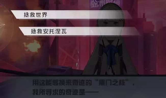 战斗后,【安托涅瓦】失去了力气,【谜之少女】出现,说道残酷的事实,【玩家】只能选择救安或是拯救世界。