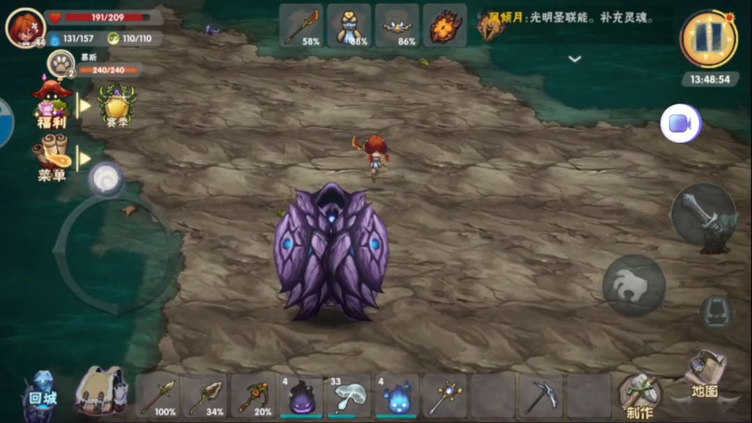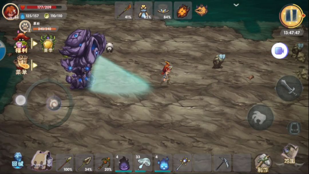 3、滚石翻涌:紫晶战神变成一个椭圆形的形状,对玩家进行三次直线翻滚。这个技能伤害还是挺高的,所以我们不能走直线,这就需要一定的走位。不过这里我推荐往上跑,让紫晶战神离开你的视野,然后在回去,这个技能就会被取消,血量也不会回复,这个非常适合新手。