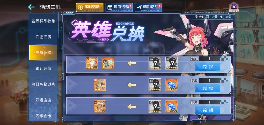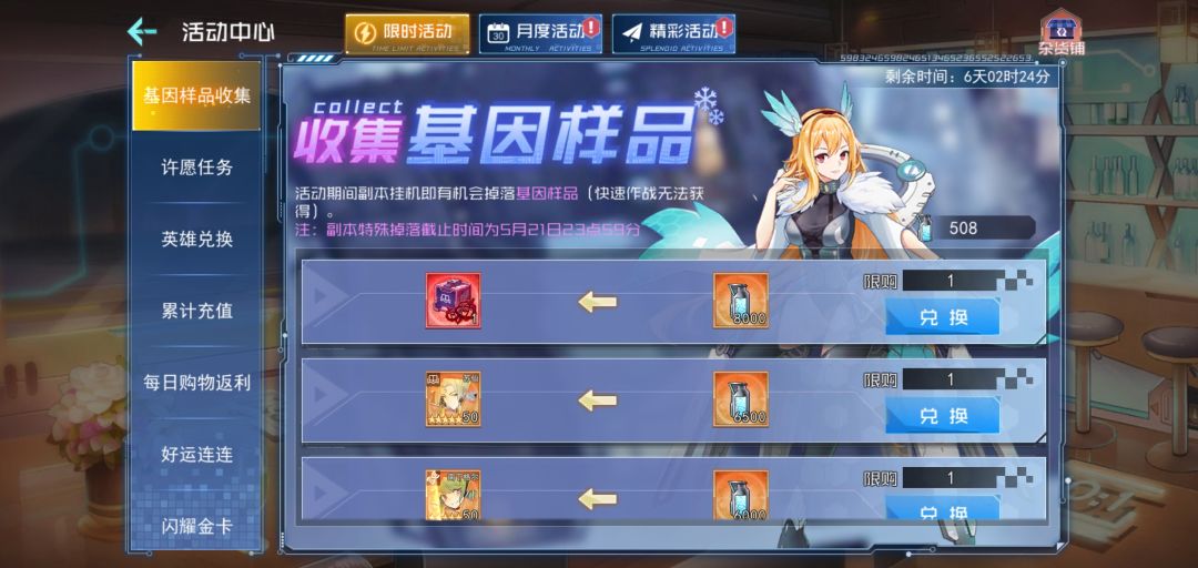 5)基因样品收集挑战:活动期间,副本挂机每天获得基因样品,可兑换神器、五星南丁、安妮、轩辕姬碎片及其它道具;(新服不参与)