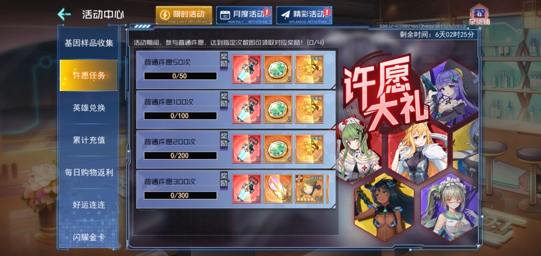 3)许愿礼包:活动期间,购买礼包可获得钻石、普通许愿币、超级基因及琉衣亲密度;(新服不参与)