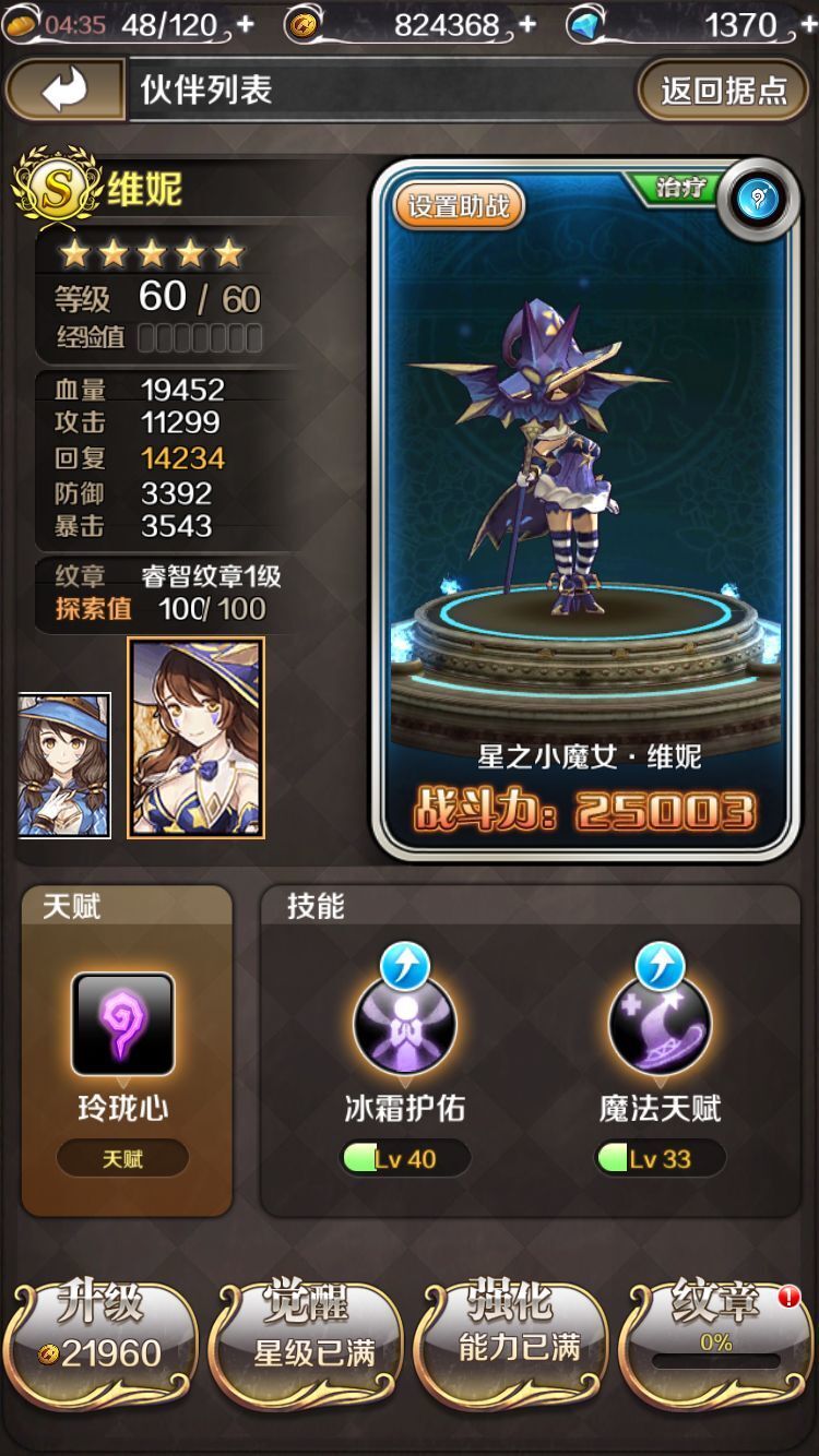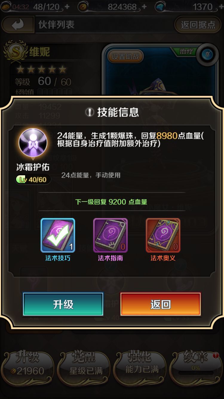 魔法天赋:战斗中,减少能量上限1点,提升回复120点,每5回合,自动生成1颗血瓶