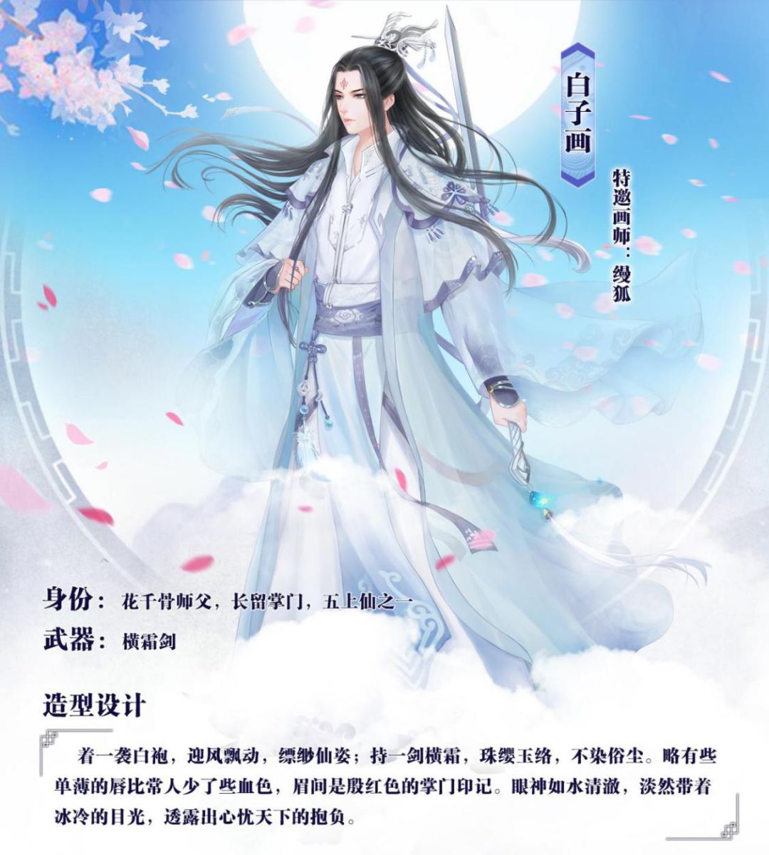 白子画作为禁欲系男神,清高傲岸,道法卓绝,具有强大的攻击系仙术。同时他的好感度也比其他角色更难提升,需要掌握他的喜好进行互动。当白子画好感度到达一定程度,将可能开启隐藏番外剧情,追寻不为人知的前尘旧梦,清冷的背后,也深藏着情愫。