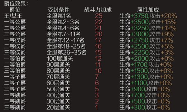 伯爵、子爵、勋爵爵位无手缝人数,可以通过挑战恶魔塔的特定层数获得。像王爵、公爵、侯爵由一等伯爵中产生,按照挑战层数高低,并有受封人数限制,挑战层数相同的勇者,排名以完成挑战时间点的先后顺序决定。