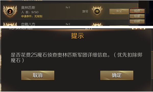 进入界面后,你可以直接选定你想查询的军团,也可以在红框中输入你想查询的军团名称,然后点击界面的“外交”按钮,就会显示“侦查”按钮了,花费魔石即可查看该军团的资料。每次查询需花费25点魔石(优先扣除绑定魔石)。