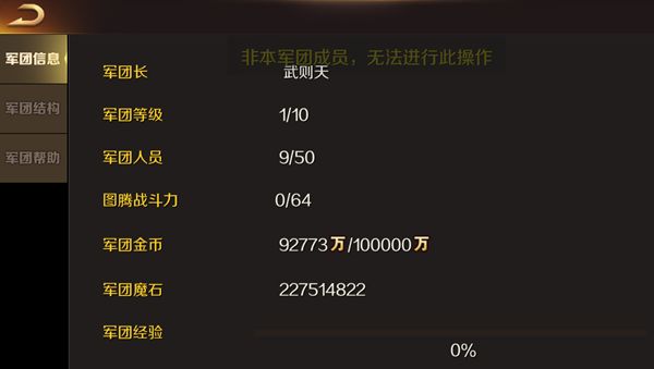 进入到其他军团的查询界面后,可以查看到其他军团的军团信息、幻兽图腾、贡献大厅以及成员管理等详细信息。