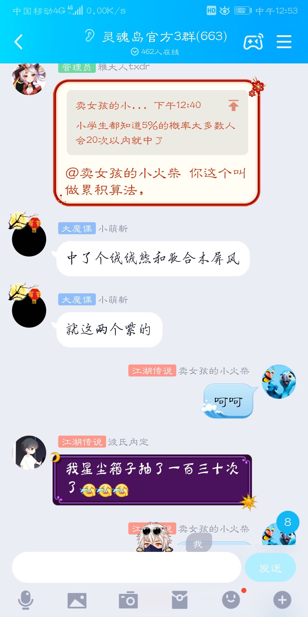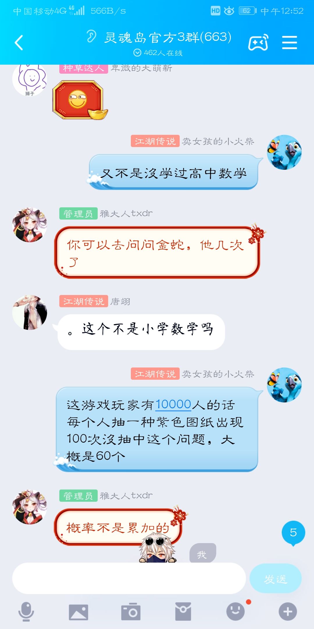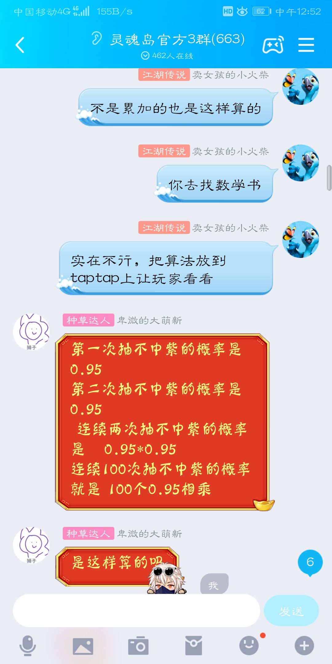 我也不知道什么是累积算法,没学过,我只知道数学期望,会用高中的排列组合知识算一下100次没中的几率。至于这游戏有10000人,不了解,有多少人100次抽不中一张紫色图,也不知道。我只看到了管理员的强行解释死不承认,托的搅混水。5%的概率对最高等级的物品,不低甚至可以说很高。但暗改就是可耻,哪怕你改成1%,你不要骗人,这是基本,捞钱要遵循基本法,做的好不好是另一方面,你不能来恶心人。
