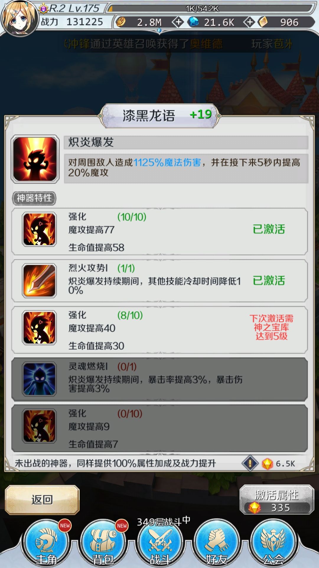这里说几个小技巧(BUG?),推图进入boss战时,系统会清除各种BUFF以及刷新技能CD( 出战NPC的技能CD不重置),但是!本萌新发现,卡好时间可以把BUFF带进boss战,具体操作, 刷完30个小兵以后,出现boss战按钮,然后等,看芙蕾雅(其他NPC还没测试,有兴趣的小伙伴 可以试下)抬手的一瞬间按进入,会出现战斗图标,这时候你会看到芙蕾雅刚好给你上完BUFF, 于是开场就是一顿暴揍!顺便找boss的时候还可以刷新下芙蕾雅的cd,更快出第二次技能用于爆 发。另一个是战力影响,推图boss战力如果显示橙色,一般能手动打过去,只是比较危险,但是 如果显示红色,基本就是完全打不过了(大佬也许行,萌新从来没有打赢过红boss),这时候只 能提升战力来让红色变成橙色了,一般提升战力的项目就不多说了,重点说说神器和技能对战力 的英雄,尝试以后发现,魔法型神器战力提升高于物理型,如图: