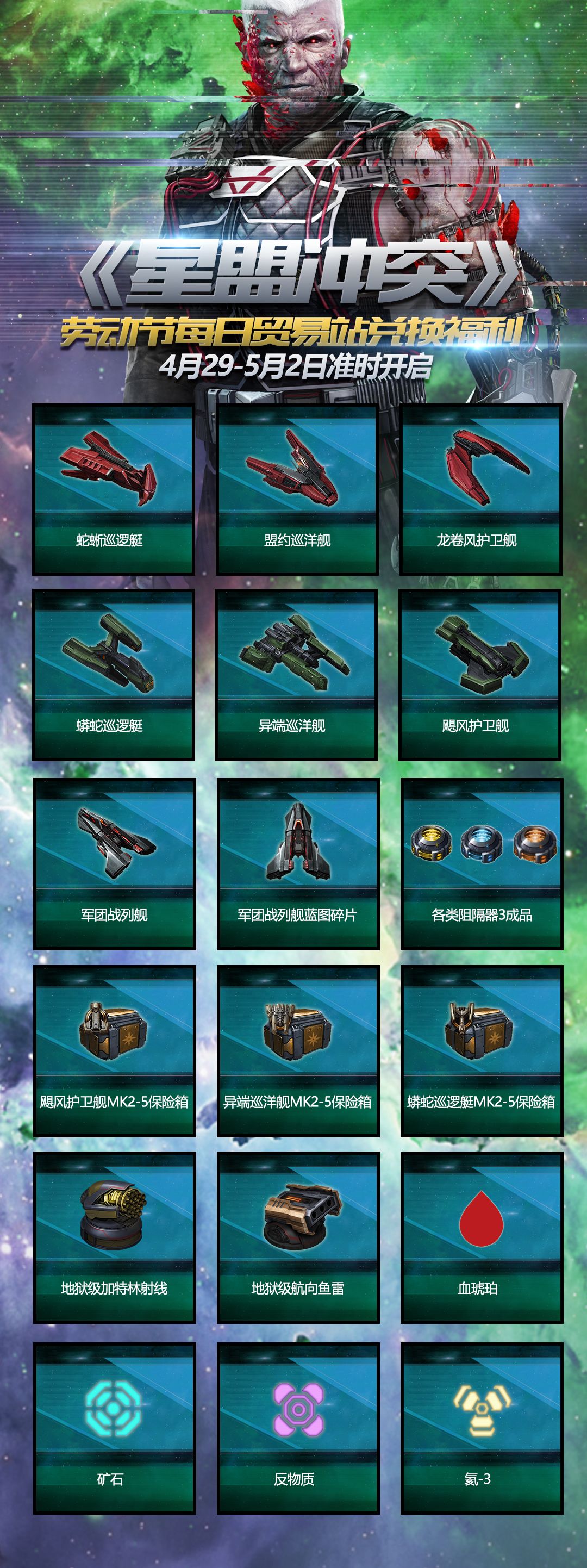 劳动节每日贸易站兑换活动也于4月29日-5月2日准时开启,持续4天,当然, 5月1日当天,所有用户登录后都可以获得军团战列舰蓝图,消耗金币即可兑换成品。各位反抗军指挥官千万不要错过!