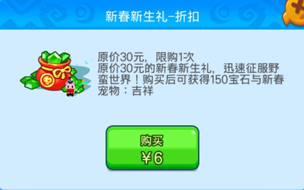 新春新生礼特别优惠活动,在活动期间购买指定折扣商品能够以极低的优惠价格拥有150个原谅宝石与新春宠物:吉祥!一个征服野蛮世界的大好机会,每人限定只能购买一次哦!