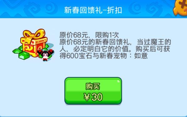 在新生礼之上还有一个优惠力度更大的特惠活动——新春回馈礼,前所未有的优惠力度与奖励宠物捆绑在一起,内含600原谅宝石与新春宠物:如意。