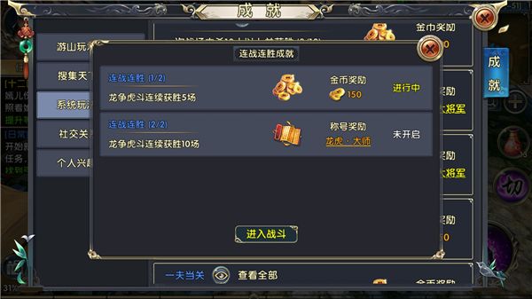 连战连胜成就分为两个本分需要:龙争虎斗连续获胜5场和龙争虎斗连续获胜10场.