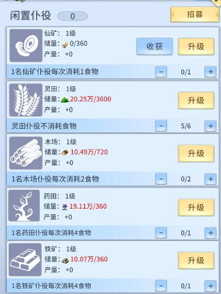 药田:可以生产药草,药草主要运用在仙友修炼升境,每名仆役在此消耗 4 点食物。五、铁矿:主要生产精铁,精铁主要运用在法器炼灵、重铸和聚灵阵升级消耗。