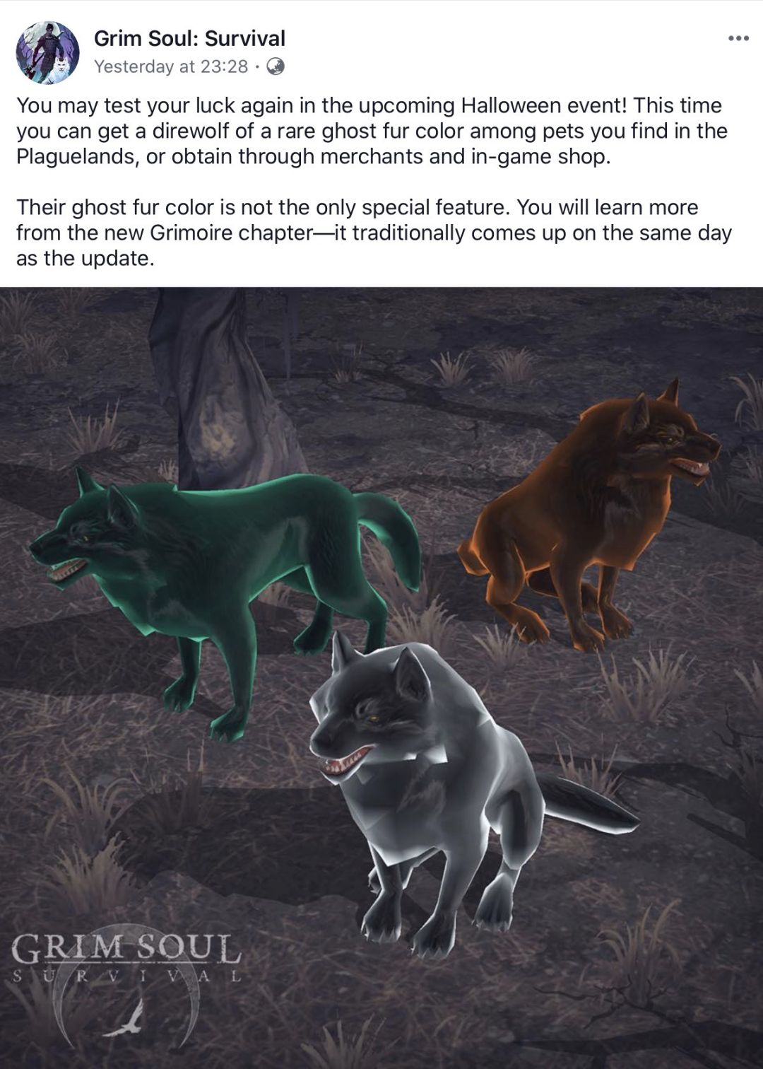你可以在即将到来的万圣节活动中再次碰碰运气!这一次你可以在瘟疫之地的宠物中得到一只罕见的幽灵皮毛颜色的恐狼,或者通过商人和游戏商店获得。他们的幽灵毛皮颜色不是唯一的特点(个人推测:这句话意思就是这些恐狼还有其他不一样的地方,很可能是他们会拥有新的或是更强的技能)。你会从新的《魔法书》章节中了解到更多——它通常会在更新的同一天出现。
