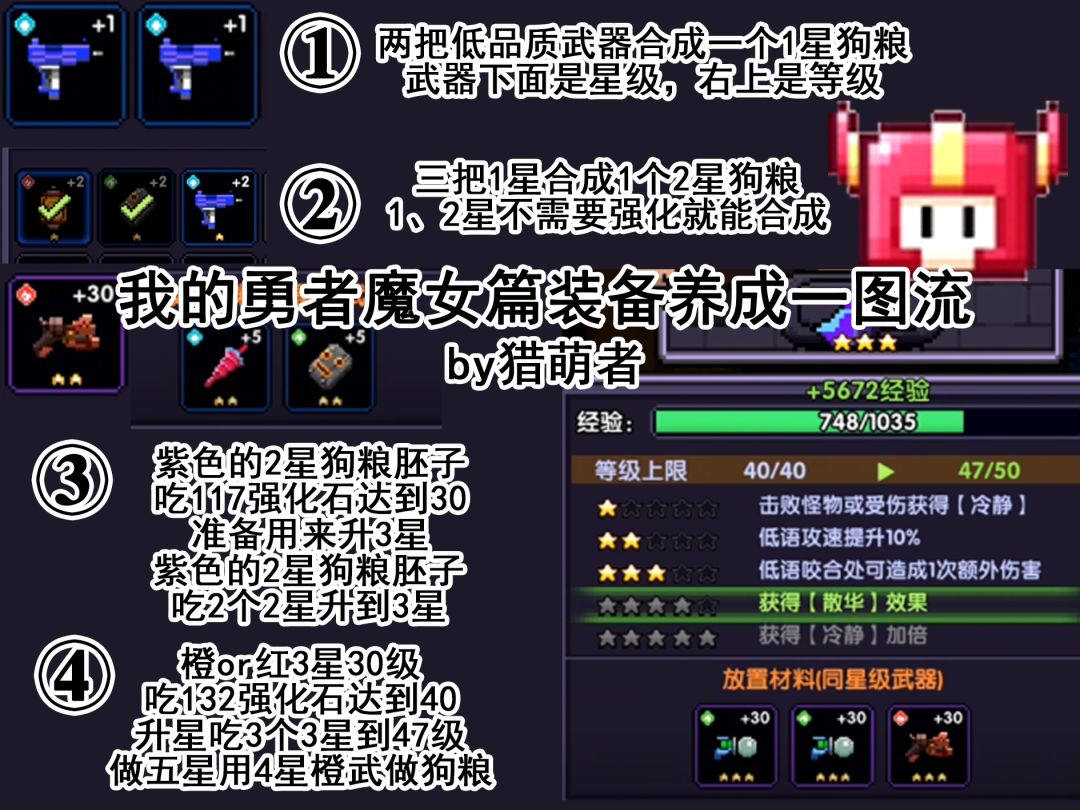 橙装做4星狗粮,吃132个强化石从3星狗粮升到3星满级,然后吃3个3星狗粮成为4星狗粮。当然,第一个4星还是要用的主力武器。