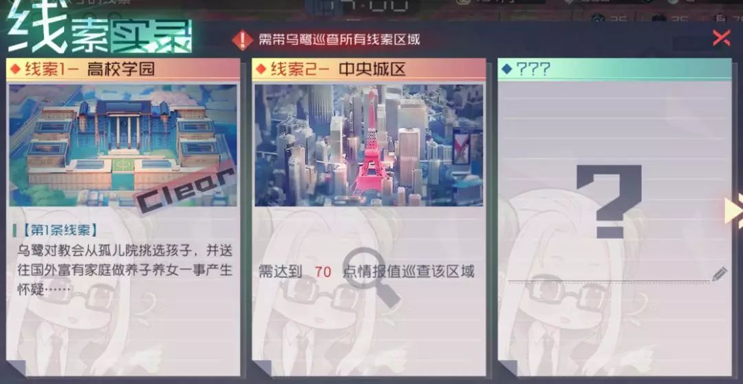 携带乌鹭巡查【中央城区】,触发剧情【新的线索】(1次行动)