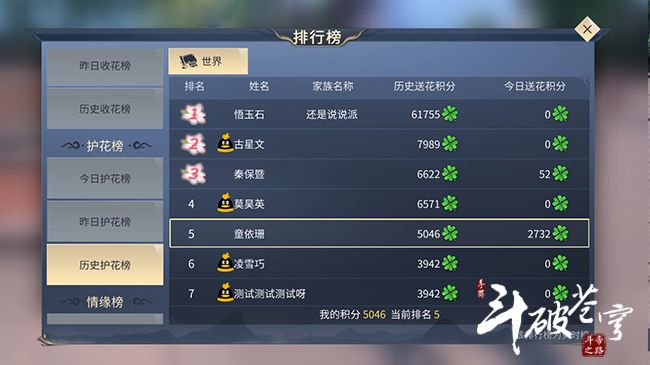 除了道具之外,游戏内还增加了全新的收花/护花/情缘榜,其中收花榜分别展示斗者昨天、今天以及历史最大收花记录,护花榜展示斗者昨天、今天以及历史最大送花记录,这两个榜单的第一名,会在第二天收到实效为24小时的炫酷称号和腰部挂件,而情缘榜则分为本周情缘榜和历史情缘榜,其中本周情缘榜每日20:00会产生本日“十大情缘”,这也是购买大烟花·爱满天的必备条件之一。历史情缘榜则是记录情缘斗者历史获得的亲密度值最大值,需要注意的是,如果斗者解除情缘或者删号,将会立刻从情缘排行榜删掉记录,所以操作要谨慎哟。
