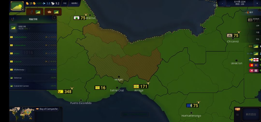 之后,玛雅渐渐富有起来了,在首都建了第一个港口,弄了1000兵打下了古巴岛的最西端,也算是第一个征服的中立地区。玛雅文明也进了世界50强(本来120多名),前期发育就在这200回合里奠定了基础。后面我会继续发帖,让我们一起关注玛雅文明的崛起!