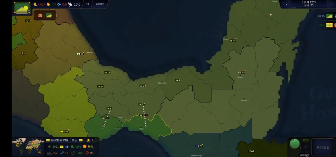 游戏开始,玛雅国虽然是个种族,但是地区数量和发展度比周边国家高,可以算是一个老大哥。为了更好发展,并且周围某些国家中断了对玛雅的外交关系。我就开始了西征。西征十分顺利,推平了一个国家,但是没有完全占领,因为点数不够QwQ。不过签条约还是拿到了五块地。这对于刚开始发展的玛雅已经算多了。